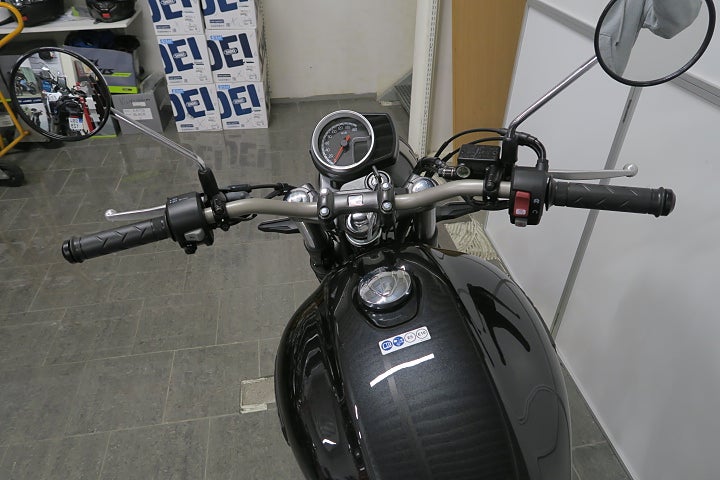 - och den sitter stadigt i en semidubbel stålvaggram med den rätta känslan och stilen. Fjädringen smälter också in i det traditionella stuket med en 41 mm konventionell framgaffel och dubbla stötdämpare baktill. En stor 310 mm skiva med tvåkolvsok framtill hejdar det eleganta ekipaget effektivt. Designen är tidlös och avskalad med nostalgiska former på både bränsletank